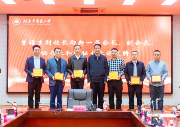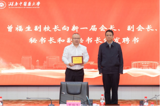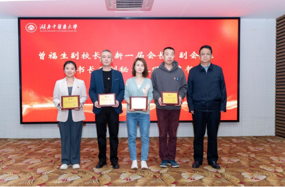 曾福生副校长向新任会长、副会长、秘书长和副秘书长、颁发聘书。